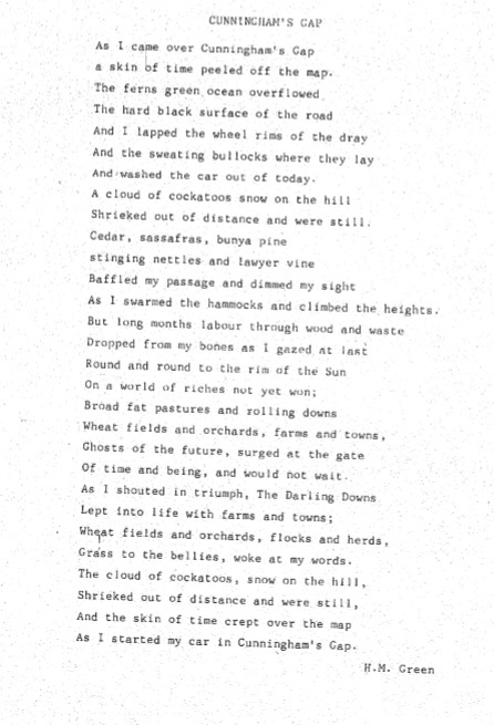 A Poem - 'Cunningham's Gap' - by H.M.Green.