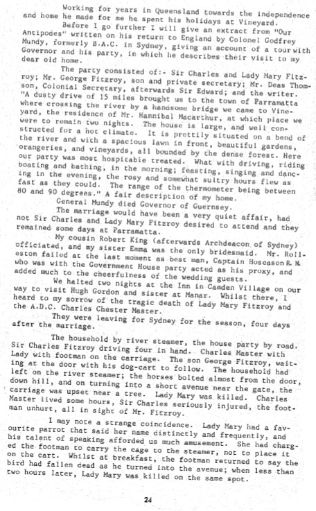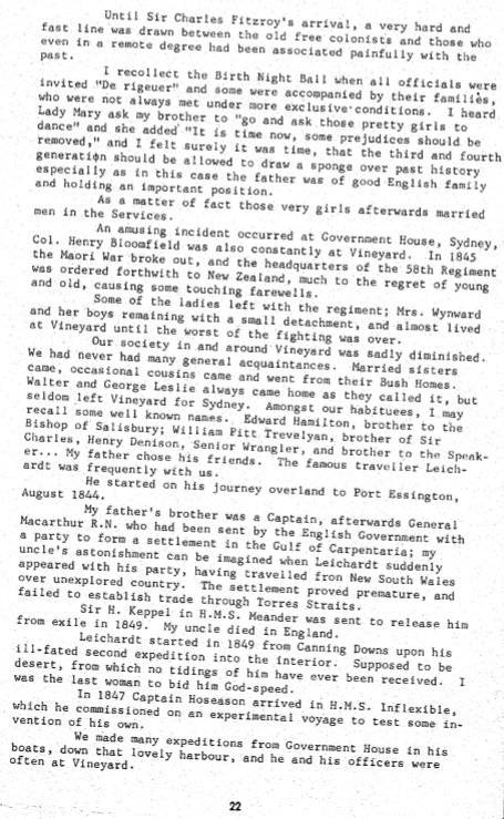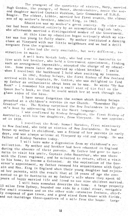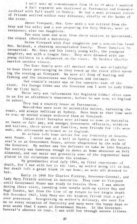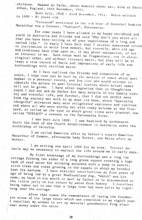 Recollections of Emmeline Leslie (nee Macarthur) Emmeline Leslie wrote recollections of her childhood at The Vineyard, Parramatta, and of her marriage to George Leslie, one of the Leslies - sons of William Leslie of Warthill, Aberdeenshire - who had come to Australia to start new lives in the 1830's. Emmeline's sister married Hugh Gordon of Manar, near Braidwood, New South Wales. After Patrick Leslie had blazed the trail, George and Emmeline journeyed to the Darling Downs to settle there. As such they were pioneers, settling in new country, in what was to become Queensland. Emmeline wrote these recollections in 1909, near the end of her long life, and there are a few minor inaccuracies in her account of events that had occurred decades ago. Nevertheless, they provide a charming and fascinating personal account of life in Australia in those days of pastoral settlement. Patrick, George and Walter Leslie had travelled to New South Wales to try to make their fortunes. They were joined there by Hugh Gordon from the nearby Manar estate near Inverurie in Aberdeenshire. Patrick, George and Hugh all married daughters of the very hospitable Hannibal and Maria Macarthur (it turned out Maria had been a friend of the Leslies' mother, and a correspondence between the two began, which with hundreds of other letters to the Scottish Leslies constitute 'The Leslie Letters'). One of the Macarthur daughters, Emmeline, married George. It is her recollections that can be read below. George was steady, reliable, and built up a large settlement - the enormous 'Canning Downs' - in the Darling Downs region. Largely due to George's efforts, Queensland became a separate state in 1859. Patrick Leslie, who was a close and faithful friend of Hugh Gordon, was the first brother to set off and settle in the Darling Downs. Patrick had married Catherine (Kate) Macarthur. Hugh meanwhile had married Mary Macarthur, and Patrick and Hugh had travelled far and wide looking for good places to settle. Patrick was the natural pioneer, an excellent horseman who adapted to the rough life well. In 1827, Alan Cunningham (a friend of the Macarthurs) had discovered the Darling Downs. He met Patrick Leslie, probably in late 1839, and described how to locate this as yet unsettled territory. Patrick reached the Darling Downs on 20th March 1840. By late June, Patrick - now joined by Walter - had become the first white men in the vicinity of Toowoomba, and they claimed the entire headwaters of the Condamine, comprising 500 square miles, and set up a head station which they named 'Toolburra'. Sadly for Patrick Leslie, there was an economic downturn and he fell into debt, as a result of which he ended up selling his interests to his brothers Walter and George. By 1846, Walter was also suffering financially and decided to return to Scotland, selling his interest in Canning Downs to his brother George (Emmeline's husband). On December 2nd 1847 "after the shearing was finished" George and Emmeline got married (honeymooning at Hugh Gordon's property, Manar near Braidwood). George's careful, methodical approach for a while saved the Leslie 'empire' in Queensland. In the mid-1850s George's health took a downturn - consumption - and he and Emmeline sold their property and returned to London, where he hoped to get the treatment he needed. On 22nd June 1860, with Emmeline present and all his brothers, George died. He and Emmeline never had children (though Emmeline would go on to have two sons by her second husband Captain John de Falbe - it was Emmeline's descendant Jane de Falbe who donated the Leslie letters to the John Oxley Library in Brisbane - a wonderful historical resource). Further details of the Leslies will hopefully be added to this website in due course - this overview is simply to explain the context of Emmeline Leslie's fascinating recollections. Transcriptions of the Leslie letters, along with Emmeline's recollections below, and many of the details on this page, were gathered and collated by Simon Kelleher, one of the Manar family historians. Emmeline died in 1911.
